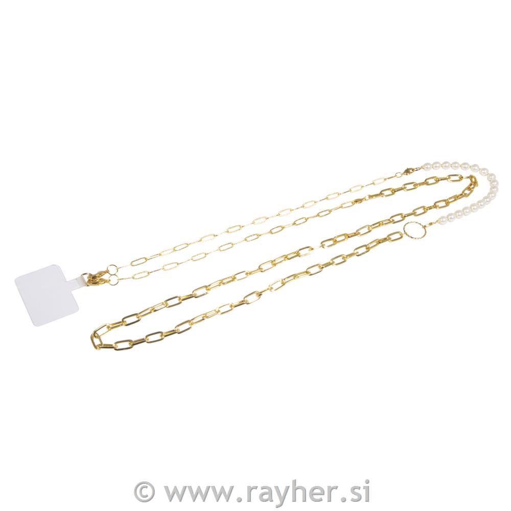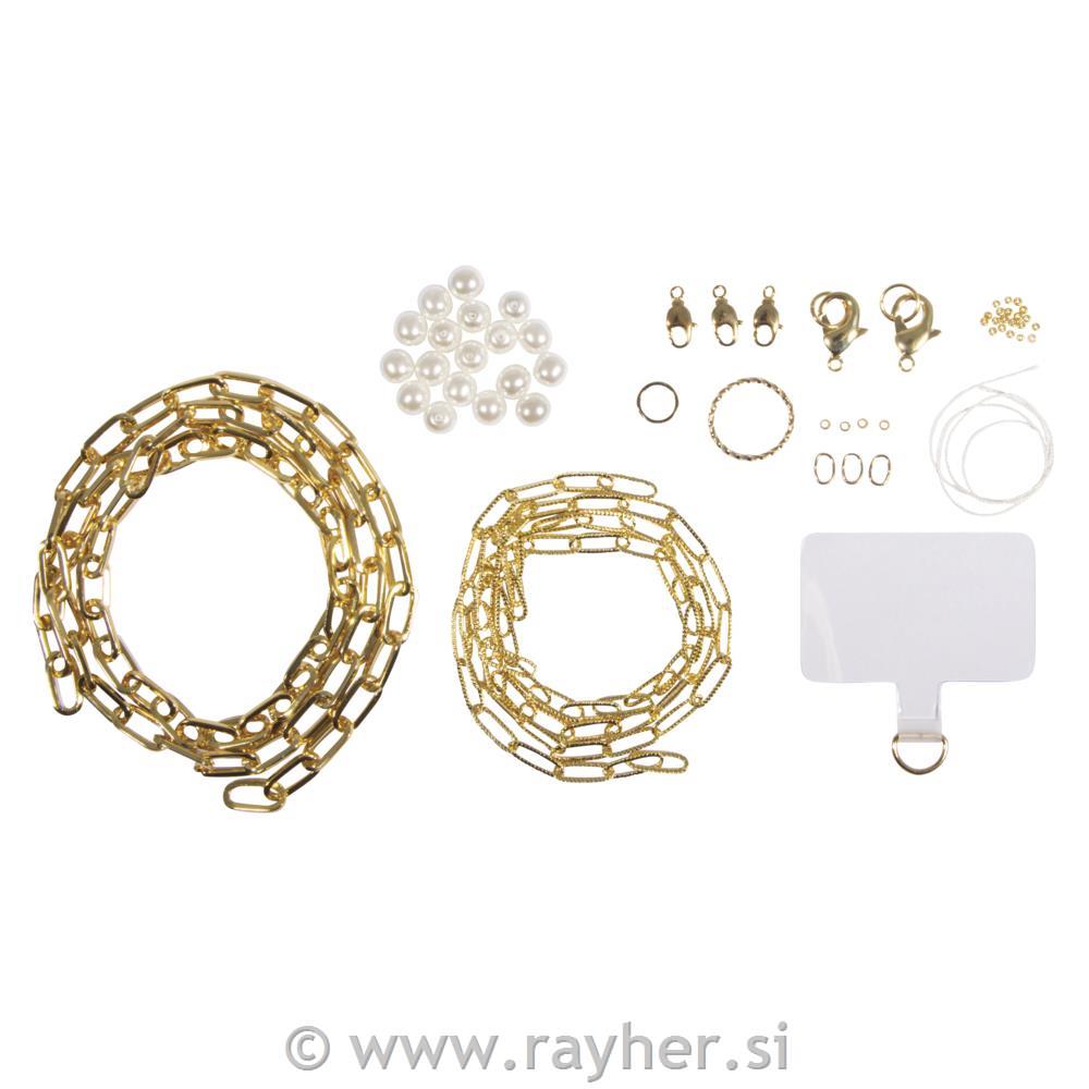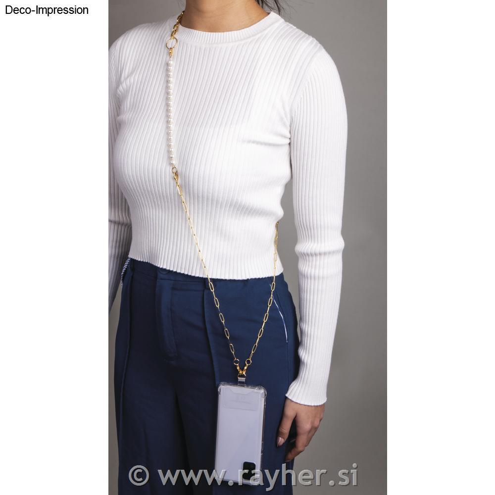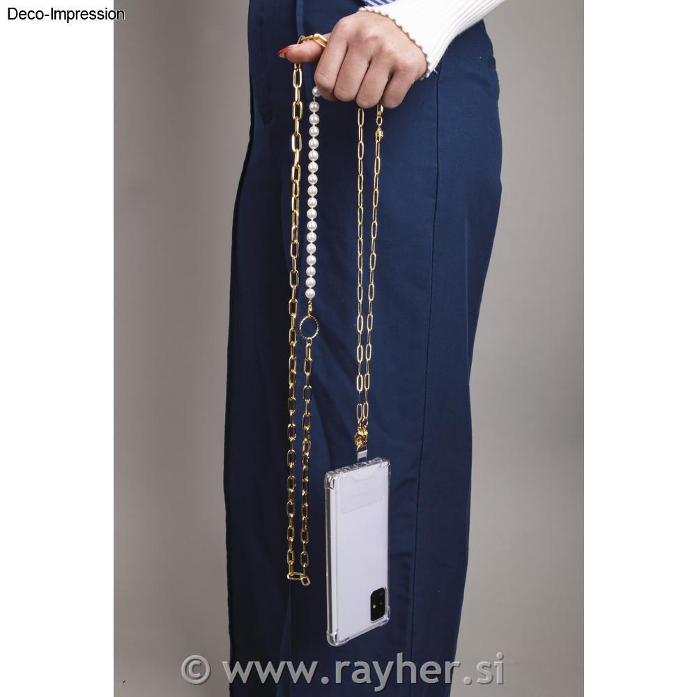 Praktičan i elegantan lančić za mobitel izrađen od lančića, perli i staklenih voštanih perli. Sofisticirani koncept "Click, Mix & Match" omogućuje to: zahvaljujući neupadljivim kopčama, lančić za nakit može se individualno podesiti i nositi kao ogrlica ili narukvica. Da biste ga koristili kao lančić za mobitel, jednostavno umetnite univerzalni, prozirni, ultra tanki, ali čvrsti privjesak u futrolu za mobitel i pričvrstite lančić na njega.