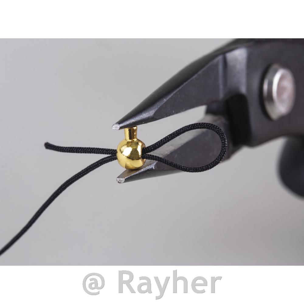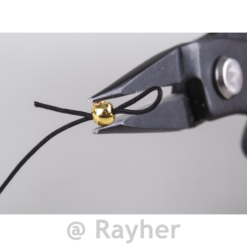 Application: string a cord, thread or wire through the hole of the bead, press together the tie bar at desired spot using tapered flat-nose pliers. Thus, cords and the like can no longer slip out.