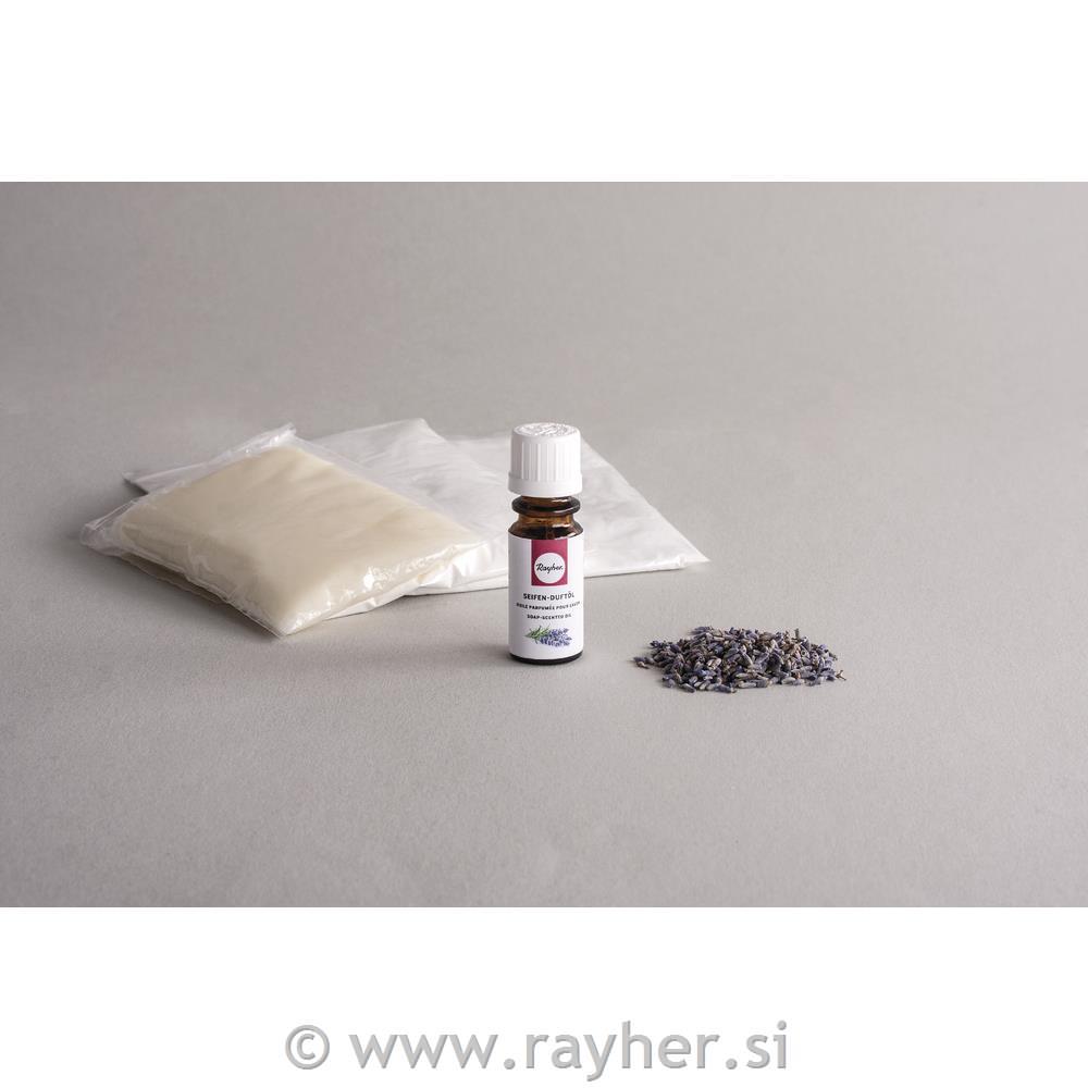 NAVODILO: Stopite komponento A v vodni kopeli ( temperatura topljenja je največ 60°C - ne zavrite). Nikoli ne postavite posode, v kateri topite milo, neposredno na grelno površino - nevarnost vžiga. Stopljeni komponenti A dodajte dišeče olje (1-3%). Primešajte še komponento B, nato pa še komponento C. Mešajte, dokler se zmes ne začne sprijemati v grudice. Počakajte, da se zmes malo ohladi, ko je njena temperatura takšna, da zmes lahko oblikujete z rokami, pričnite z oblikovanjem kroglic. Po želji lahko pri oblikovanju dodate še posušene cvetove sivke.