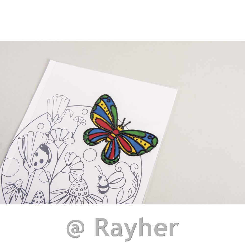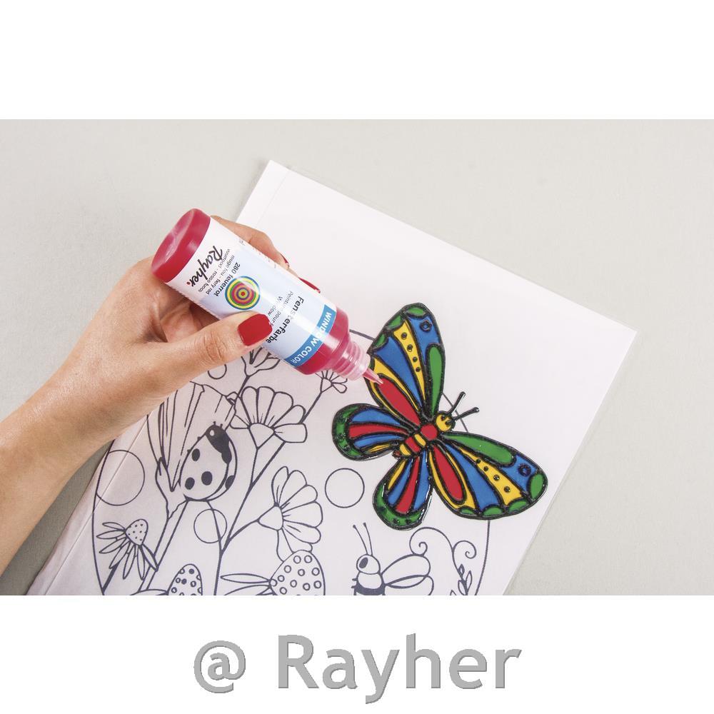 Set vsebuje: 4 lepljive barve po 25 ml, konturna pasta 25 ml, plastična folija in slikovna predloga z motivi. S konturno pasto narišite motiv na plastično folijo. Pustite, da se vsaj delno posuši. Vmesne površine pobarvajte tako, da se barva povsod dotika obrobe. Ko nanesemo