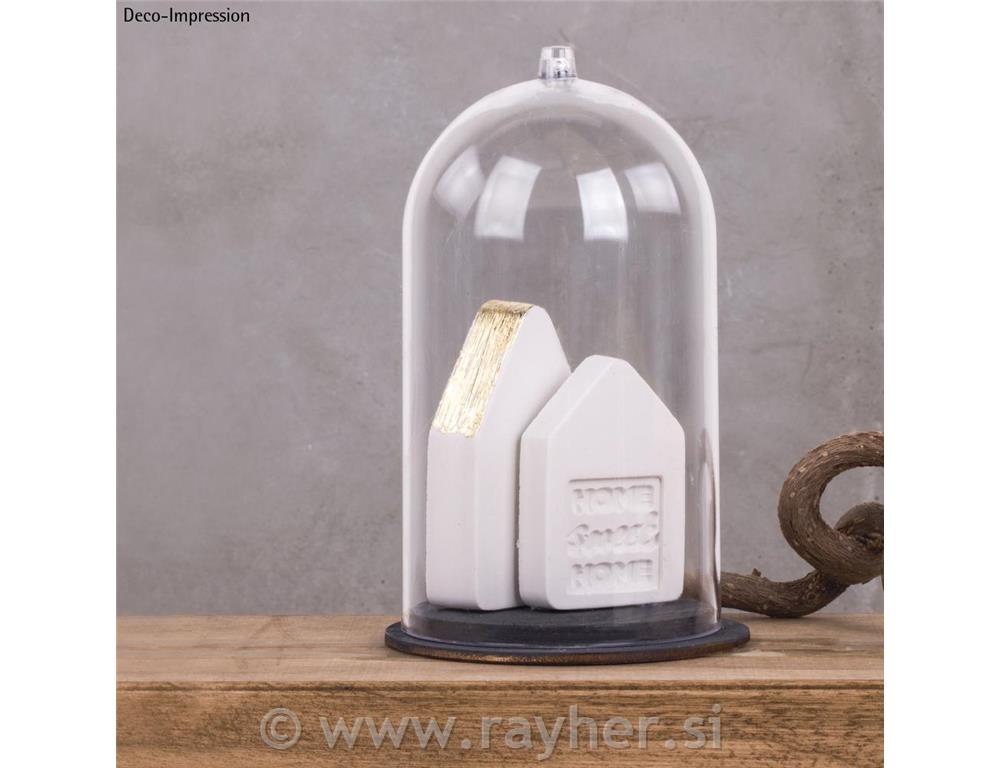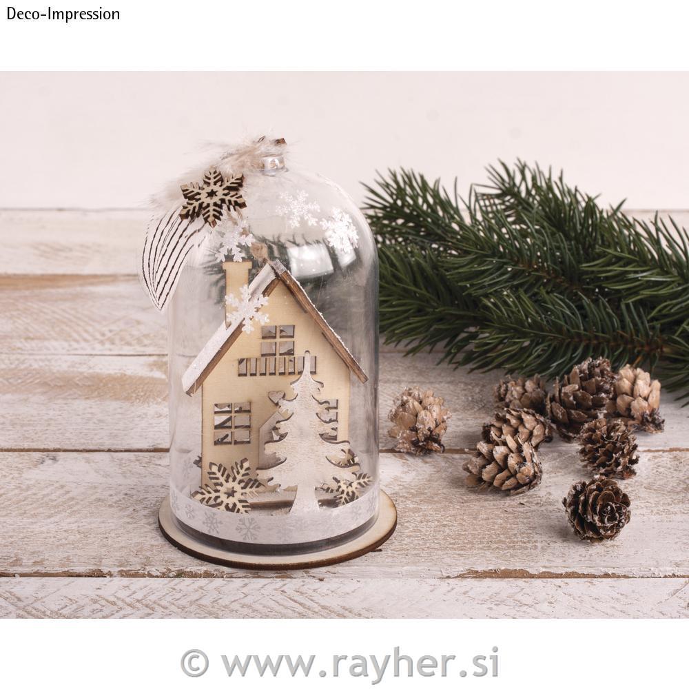 Prosojna plastična kupola je visoka 13 cm in ima okrasno vrvico iz jute. Podstavek ima premer 8 cm.