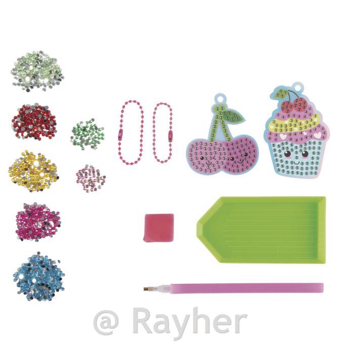 DIY set za izradu dijamantnih slika „Trešnja + Kolačić“ sadrži sve što je potrebno za izradu modernih etiketa/privjesaka za ključeve. Pogodno za djecu od 4 godine nadalje.