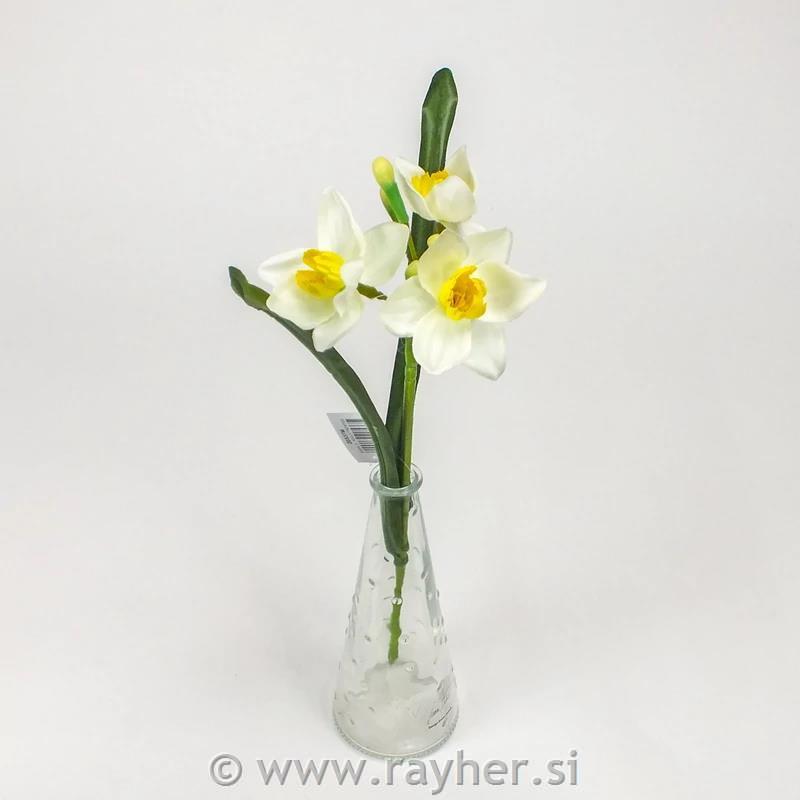 Bijelo-žuti narcis na stabljici s tri cvjetne glavice elegantno je i bezvremensko dekorativno rješenje. Vitka stabljika i trocvjetni dizajn stvaraju prirodan i skladan izgled. Idealan je za vijence, stolne dekoracije, cvjetne kutije ili kao samostalan dekorativni element.