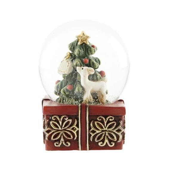 Snježna kugla na kutijici s božićnim drvcem i jelenom, polirezina, staklo, 8,5x6,5 cm