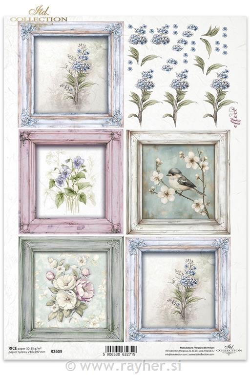 Decoupage papir, rižev A4, Cvetje v okvirju