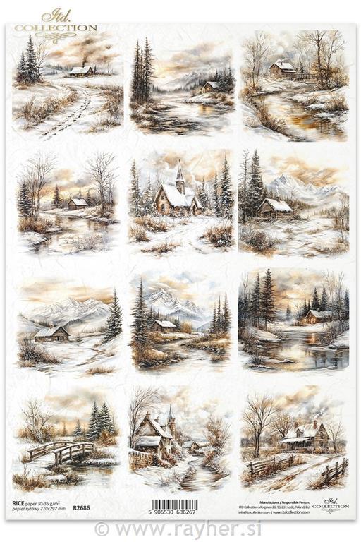 Decoupage papir, rižev A4, Zimsko podeželje