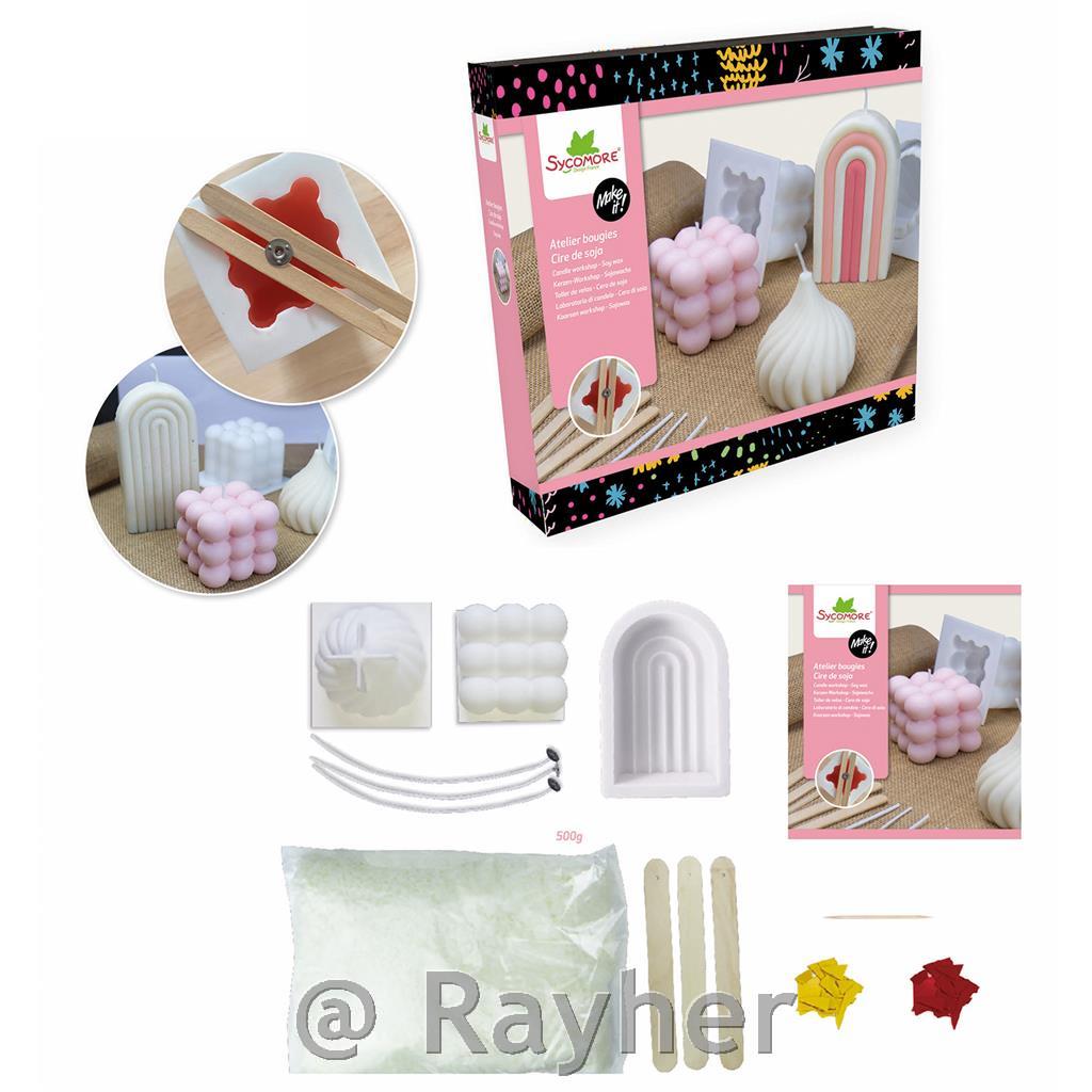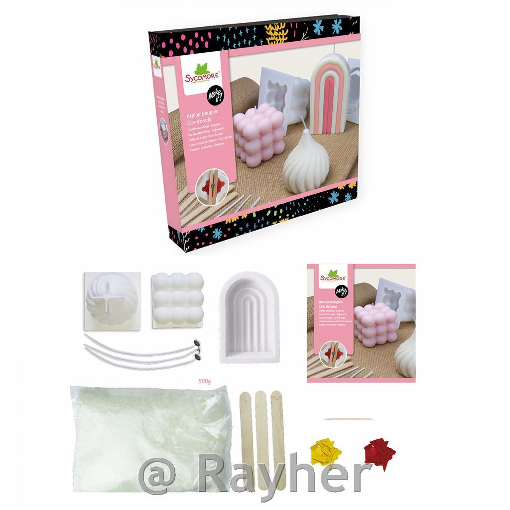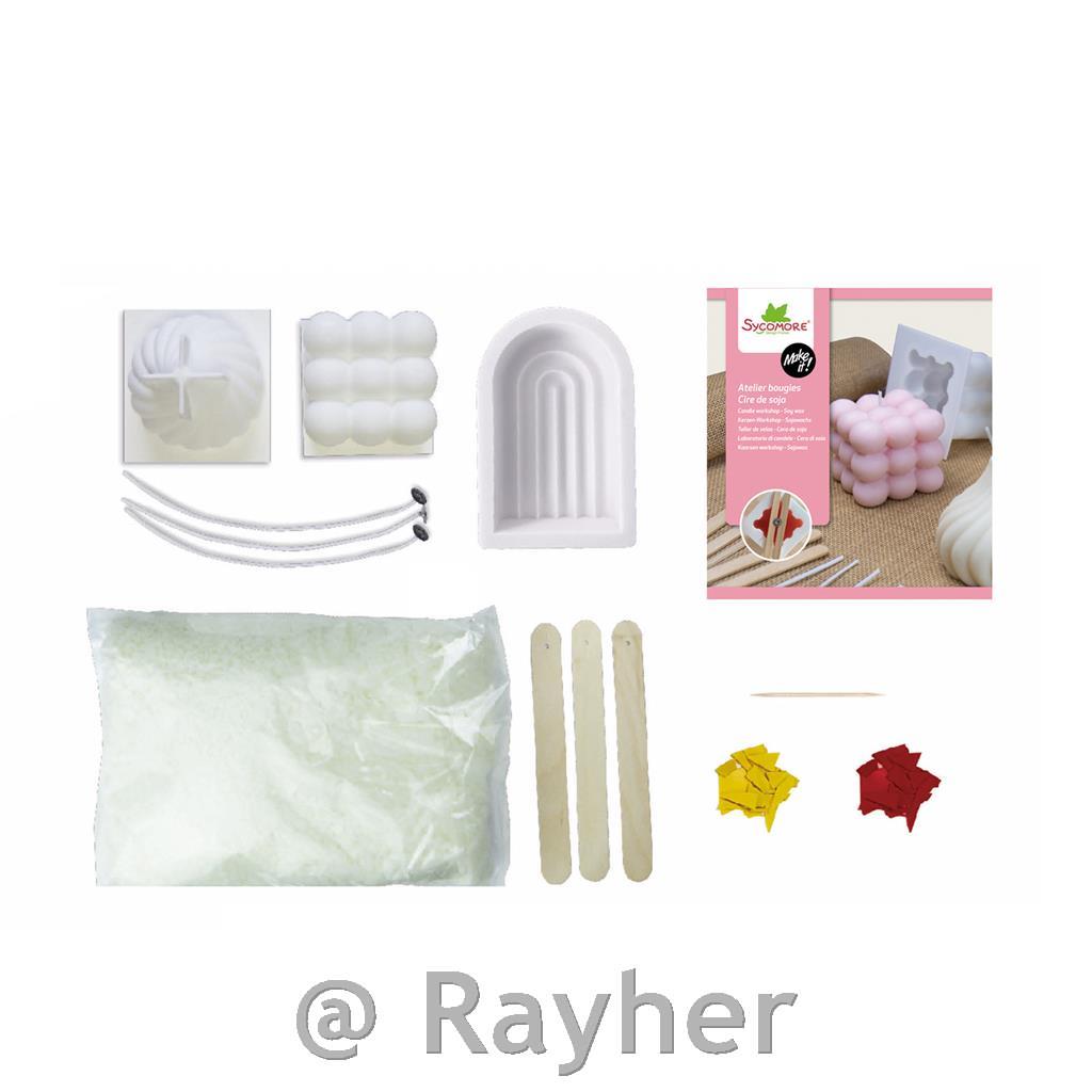 Set vsebuje 500g sojinega voska, 3 silikonski kalup, 3 stenji, 3 paličice, dve barvili, knjižica s slikovnimi navodili.