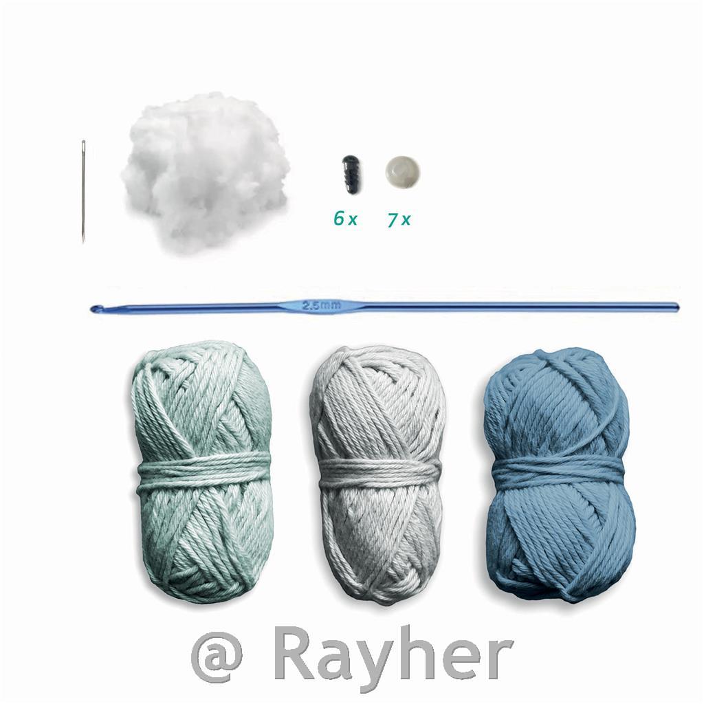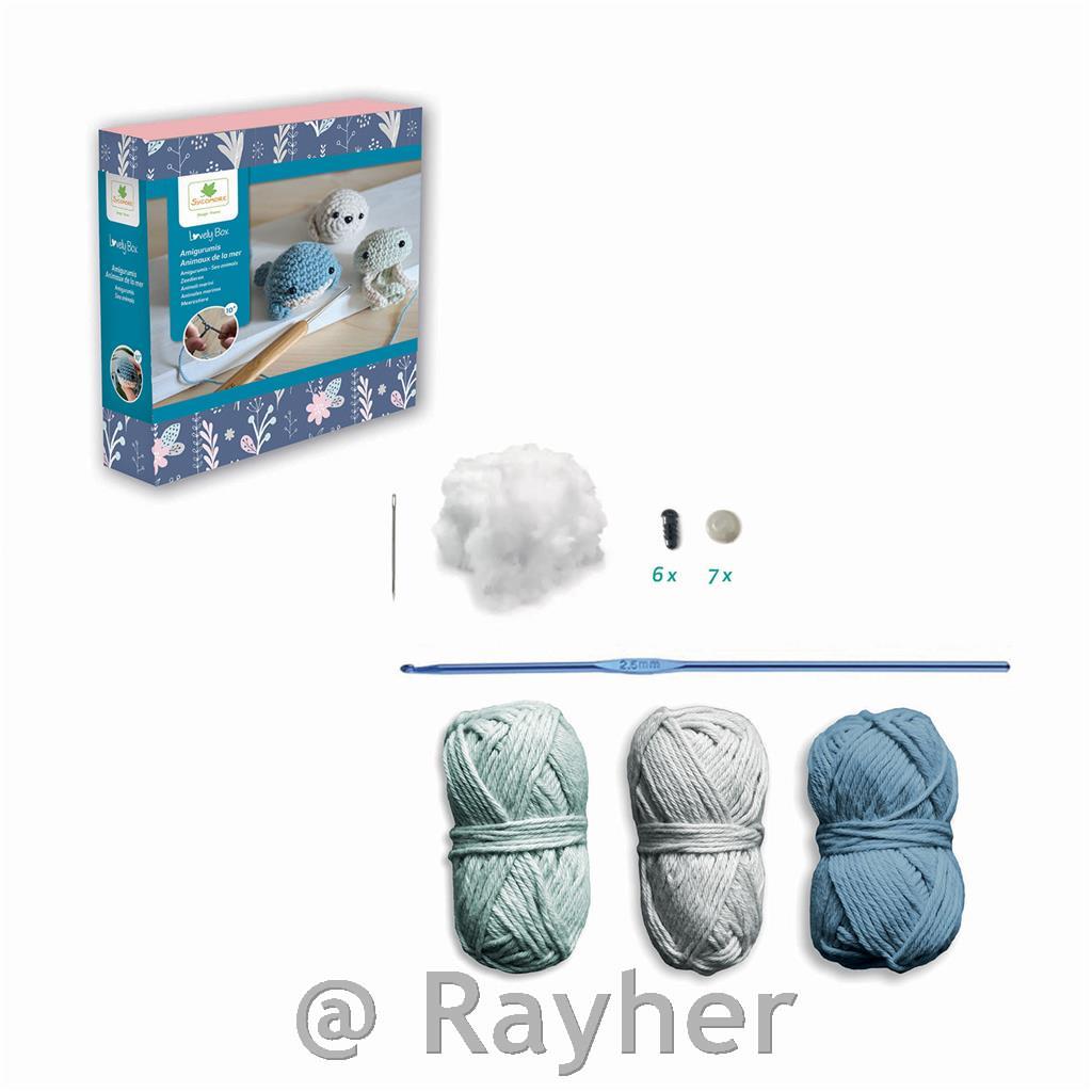 Find in this beautiful box all you need to crochet 3 Amigurumi sea animals (1 whale, 1 seal, 1 jellyfish). Contents: blue cotton thread 10g, white 20g, green water 10g, plastic eyes 6x, 1 plastic nose, large needle, filling, hook 2.5 cotton, hook and a step by step guide to guide you in your creations.