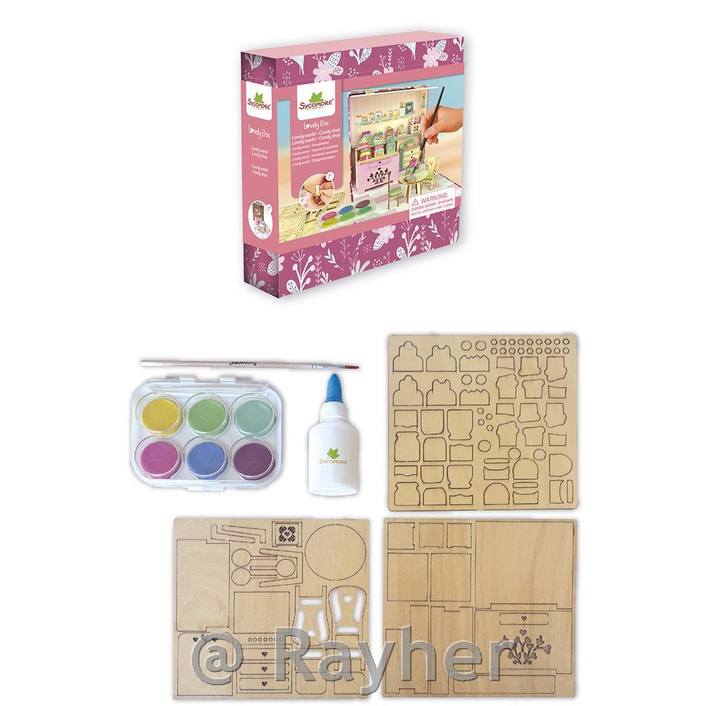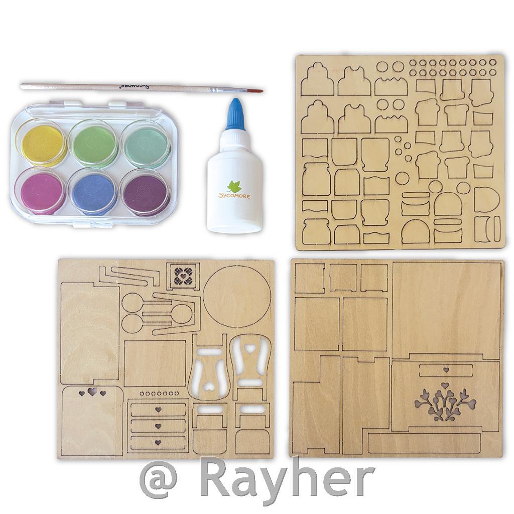 Turn the printed box into a miniature candy shop — both decorative and practical, as it also serves as a storage box! Assemble the wooden furniture — you can even paint it. Includes: 2 pre-cut wooden sheets, glue, a 6-color paint palette, 1 paintbrush, 10 wooden beads cake shapes and an instruction booklet.