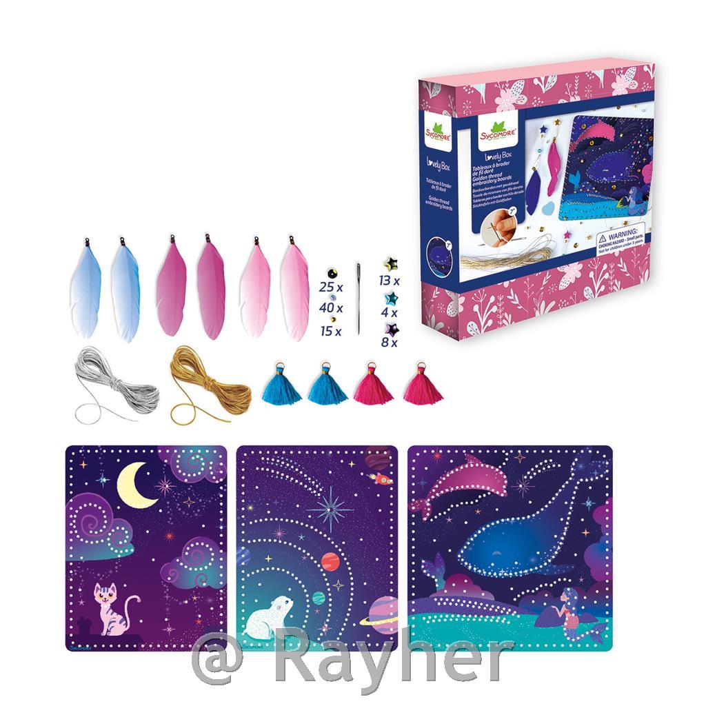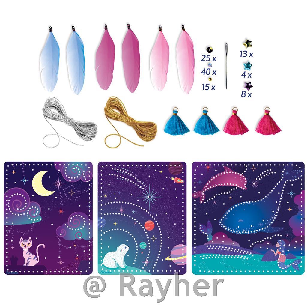 Sve što vam je potrebno za izradu 3 ilustrirane i izvezene čestitke, ukrašene zlatnim koncem, šljokicama i zlatnim perlicama različitih oblika. Sadržaj: 3 tiskane čestitke, zlatni konac, perje, perlice, privjesci i detaljne upute koje će vas voditi kroz stvaranje. Preporučuje se djeci starijoj od 7 godina.