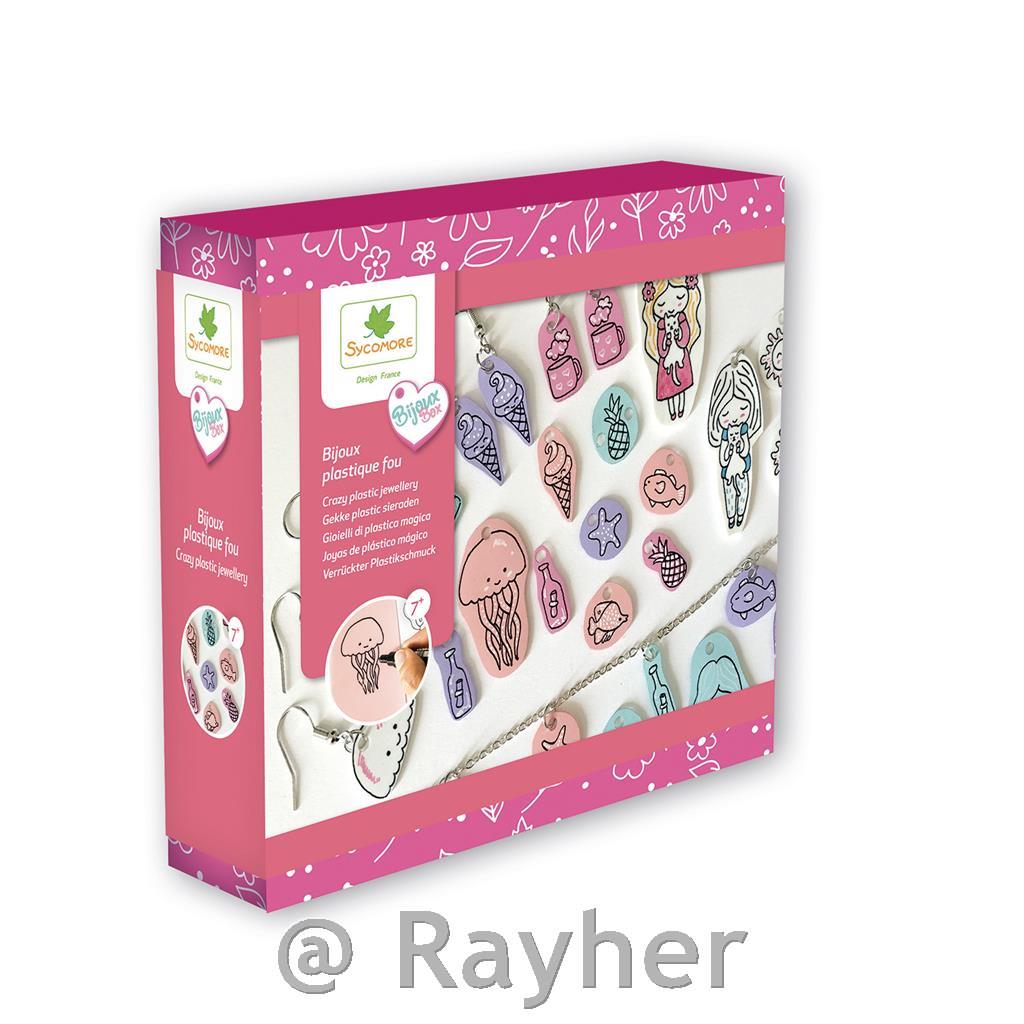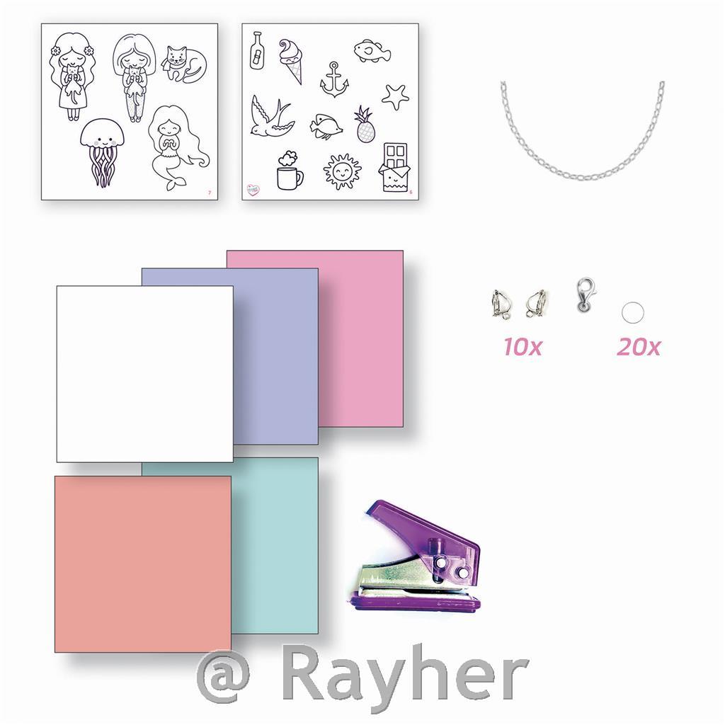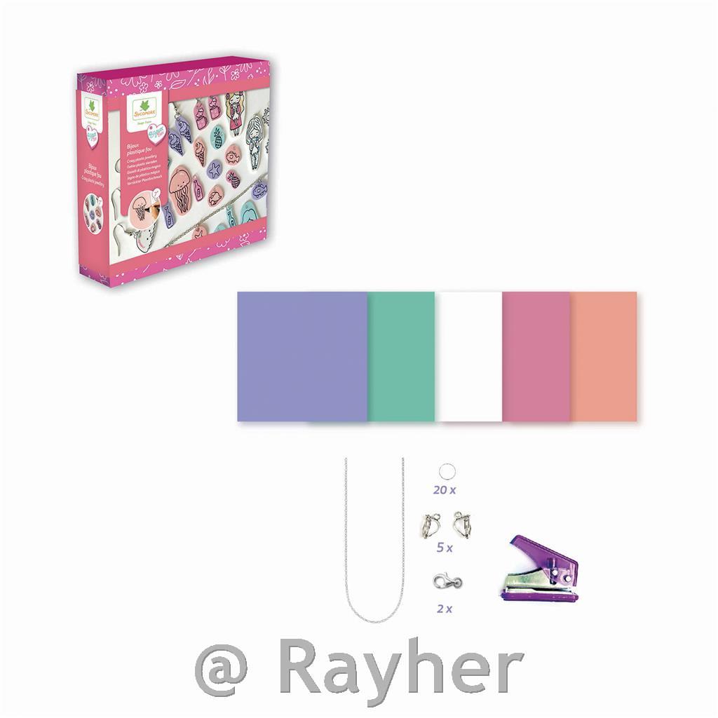 Make original jewelry in crazy plastic. This kit contains: 5 x crazy plastic boards (150x150 mm) coral, water green, pink, purple, white, rings, chain, 10 clasps, earrings, punch and 1 instruction booklet.