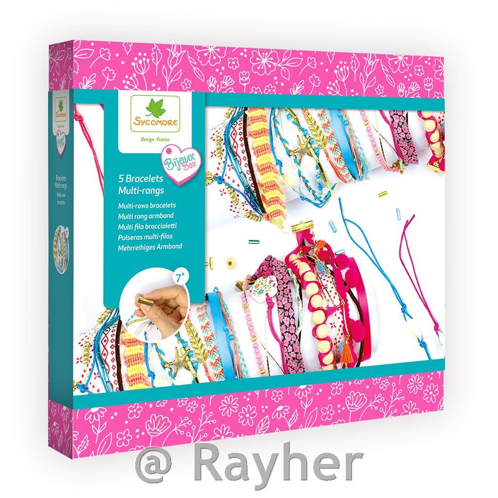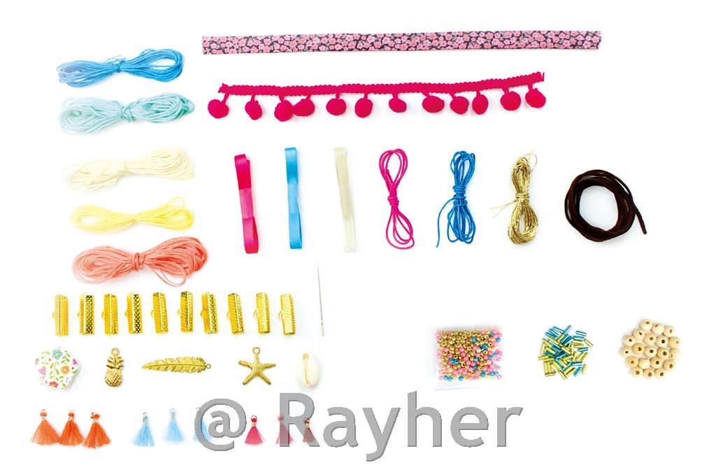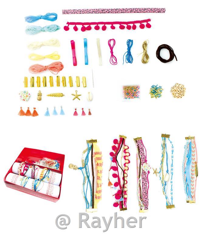 In this wonderful gift box, find out everything to create these famous trendy multi layers bracelets! This Lovely box contains: 25 m cotton thread, 1,5 m wax thread, 100 beads, 16 wooden beads, 30 tube beads, 25 cm leather thread, 25 cm pompons ribbon, steel charms, 1 shell , 1 printed bead, 75 cm ribbon, 5 chains + claps, 10 large claps, 1 needle, 9 pompoms, 25 cm printed ribbon, 2 bracelets supports and 1 booklet of instructions.