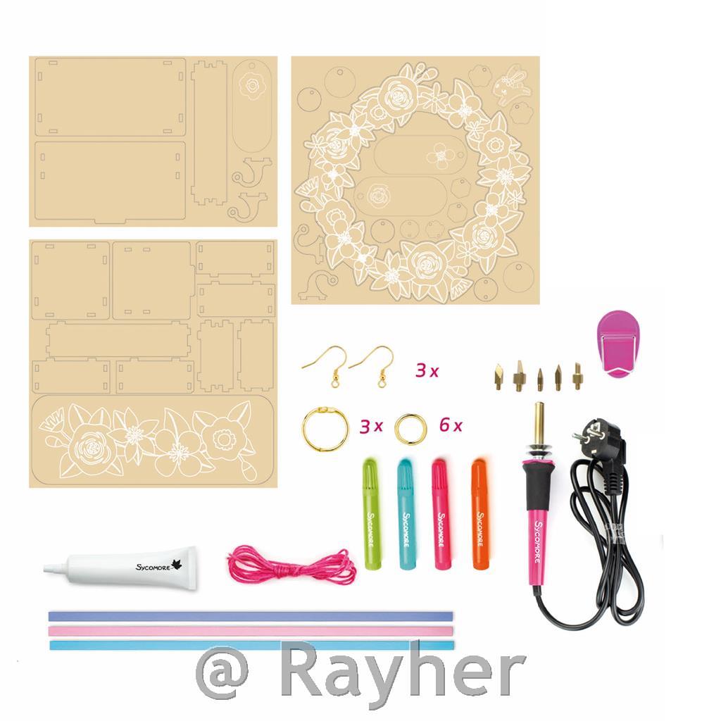 Set vsebuje laserski izrezi iz lesa za sestavo dveh šatulj, knjižno kazalo in venček ter obeske, pirograf z nastavki, 4 flomastri, lepilo, vrvice, obročki, nastavki za uhane, knjižica s slikovnimi navodili Priporočljivo za otroke nad 8 let starosti.