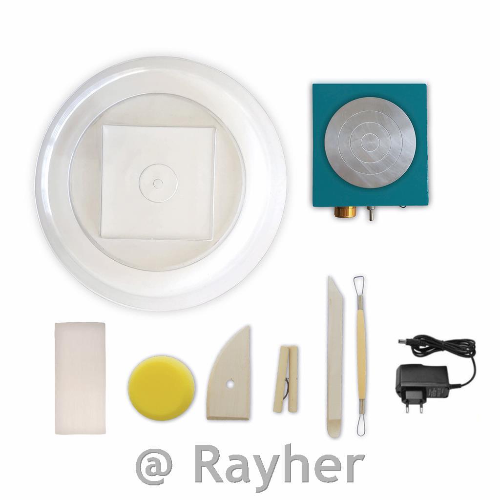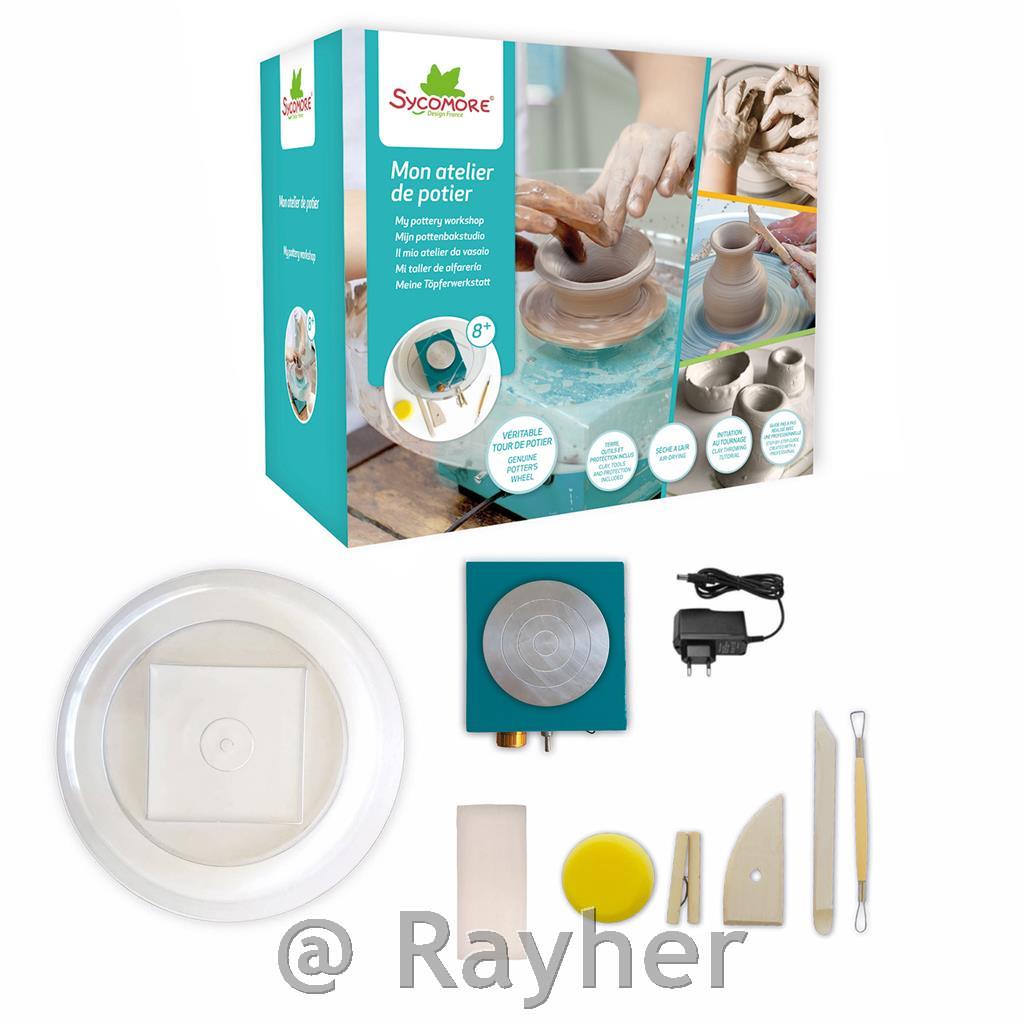 A real potter's wheel, compact, easy to store with 1 aluminum tray (10.5 ), 1 forward / reverse switch, 1 button to vary the speed (up to 1000 rS), 1 power cord + plug, 5 wooden pottery tools ideal for sculpting, modeling, cutting, chiselling, smoothing and more, a block of clay, 1 protective tray, and 1 booklet with models and instructions.