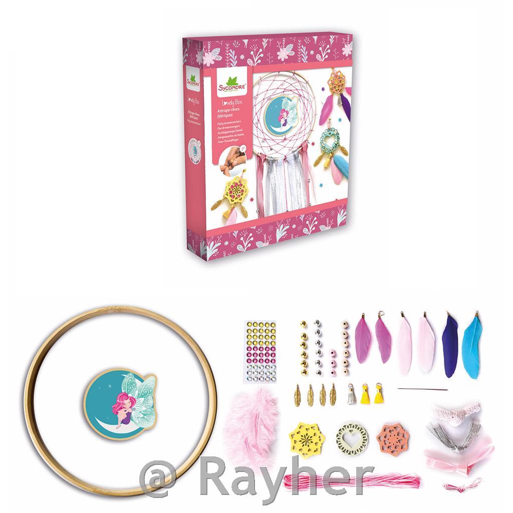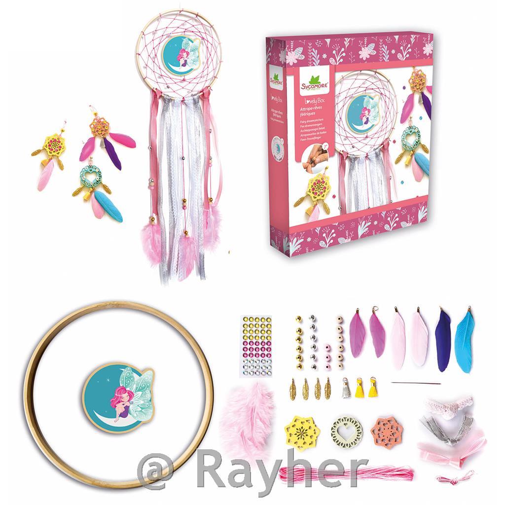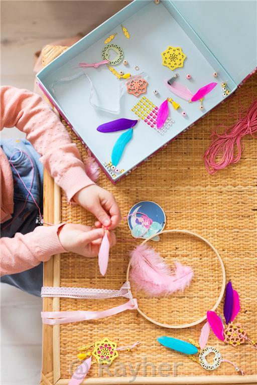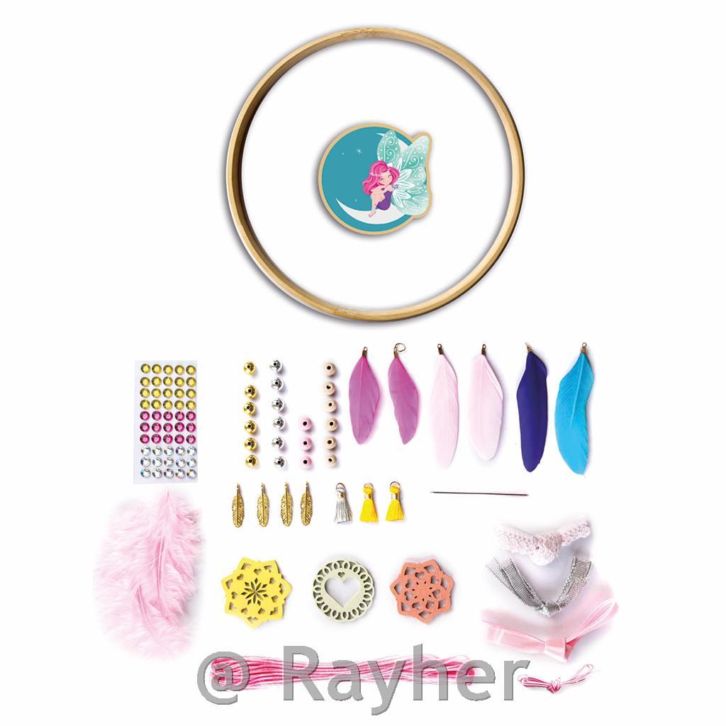 V tej škatli najdete vse, kar potrebujete za izdelavo lovilca sanj in 3 obeskov. Škatla vsebuje: 1 bambusov lesen obroč, bombažno nit, 1 vnaprej izrezano leseno ploščo, perje, trakove, perlice, čipko, cofke, šivanko, obeske, dragulje in knjižico s slikovnimi navodili. Priporočljivo za otroke nad 7 let starosti.