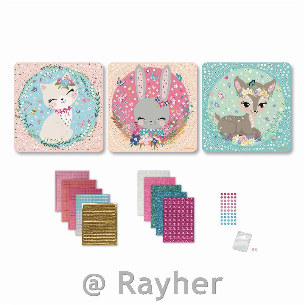Ovaj set sadrži 3 tiskana motiva slatkih životinja. Sadržaj: 1000 mozaika, 3 kartonske ploče, 3 viseće pločice, 1 list s ilustriranim uputama. Preporučuje se za djecu stariju od 5 godina.