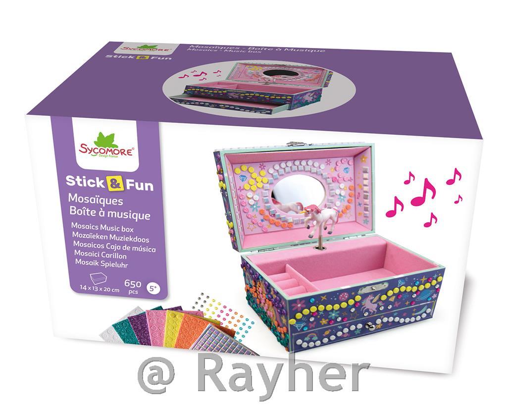 Vsebuje: glasbeno skrinjico z oznakami za mozaik, več kot 470 pisanih mozaikov, 180 draguljev in knjižico s slikovnimi navodili.