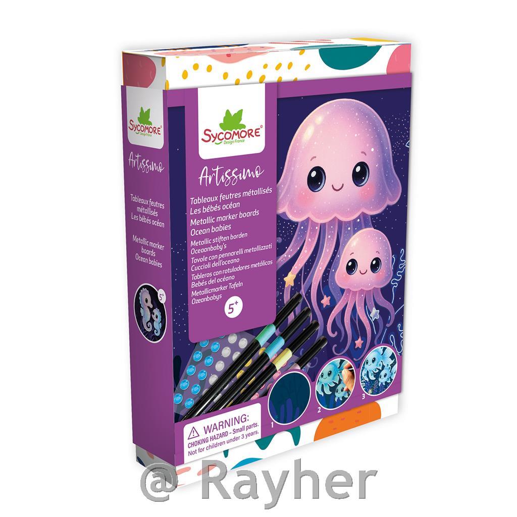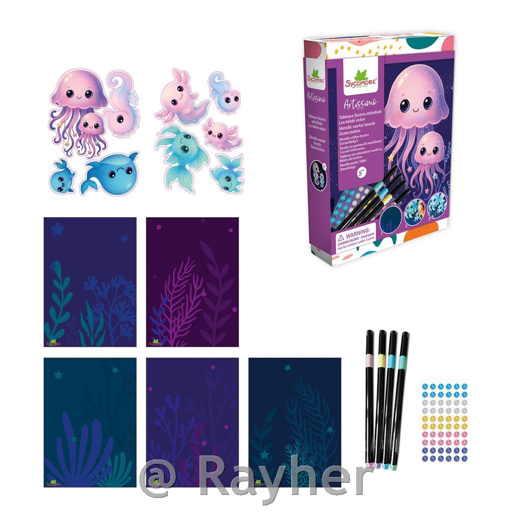 Izberejo mladiča in njegovo mamo, okrasijo morsko dno s 4 kovinskimi markerji in svoje stvaritve dopolnijo z bleščečimi dragulji. Dostavljeno v čudoviti škatli, ki služi tudi kot etui za shranjevanje. Ta komplet vsebuje: 5 vnaprej natisnjenih umetniških del na temnem ozadju, 2 lista prozornih nalepk, 4 kovinske markerje, 100 draguljev in 1 knjižico s predlogami in navodili.