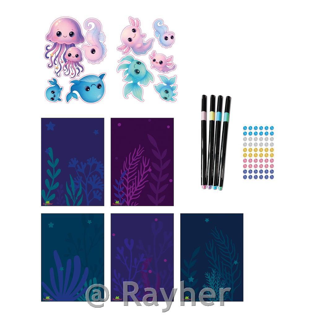 Set sadrži 5 unaprijed otisnutih morskih pozadina, naljepnice sa životinjama, samoljepljive šljokice i 4 visoko pigmentirana markera u svjetlećim bojama za stvaranje čarobnih podvodnih scena. Preporučuje se djeci starijoj od 5 godina.