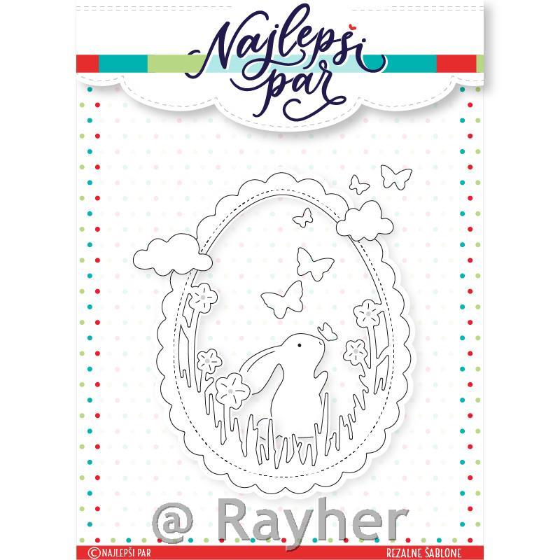 Set uključuje 8 šablona za rezanje, pomoću kojih izrezujemo valovito uskrsno jaje, koje se također može ukrasiti krajolikom u sredini, a zatim ukrasiti zečićima i leptirima.