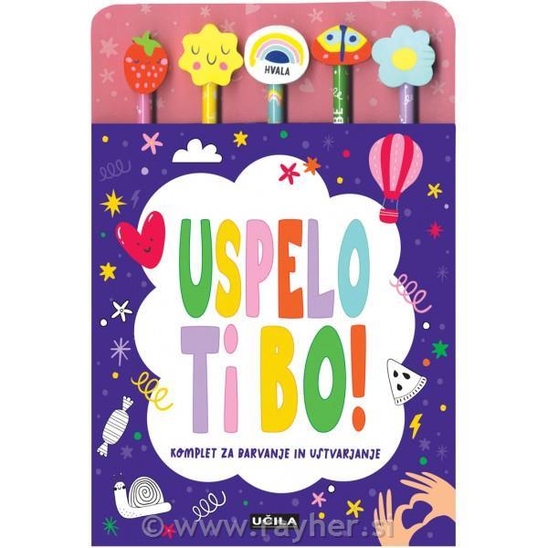 Knjiga s 4 barvicami, svinčnikom in 5 radirkami.