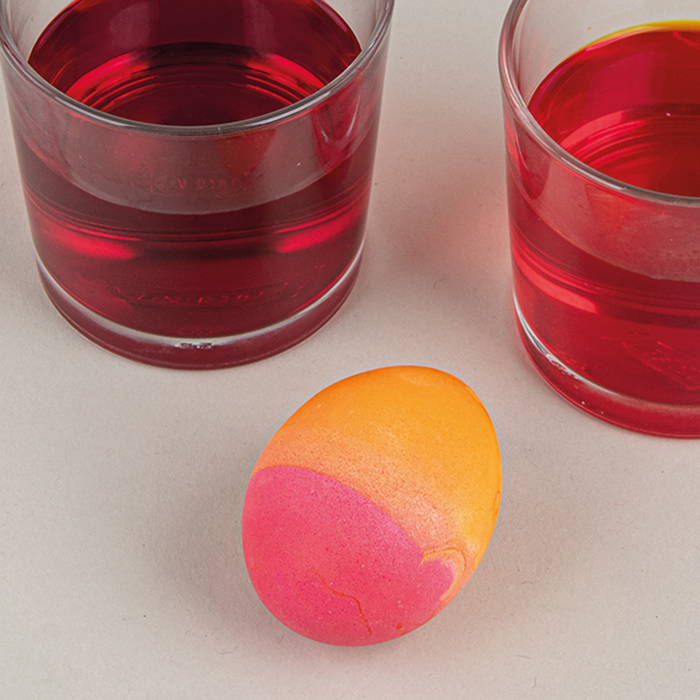 U staklenoj posudi pripremite dvije različite boje. Jaje potopite u jednu boju na nekoliko minuta, ali samo do polovice. Pričekajte da se jaje kratko posuši, zatim ga okrenite i potopite drugu stranu u drugu boju. Boje možete i djelomično preklapati (umakati jednu preko druge). Višak boje ocijedite na kuhinjskom papiru i pustite da se osuši.