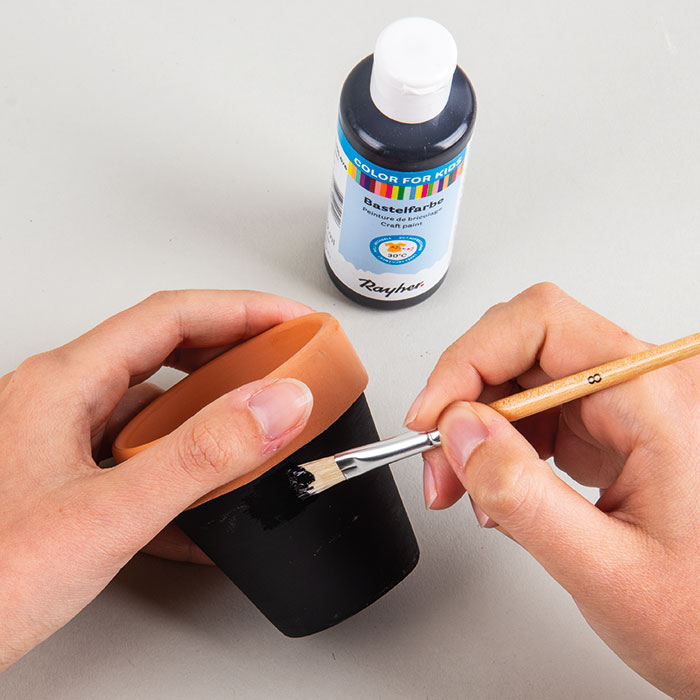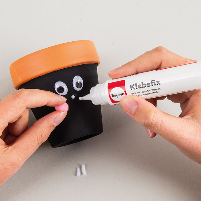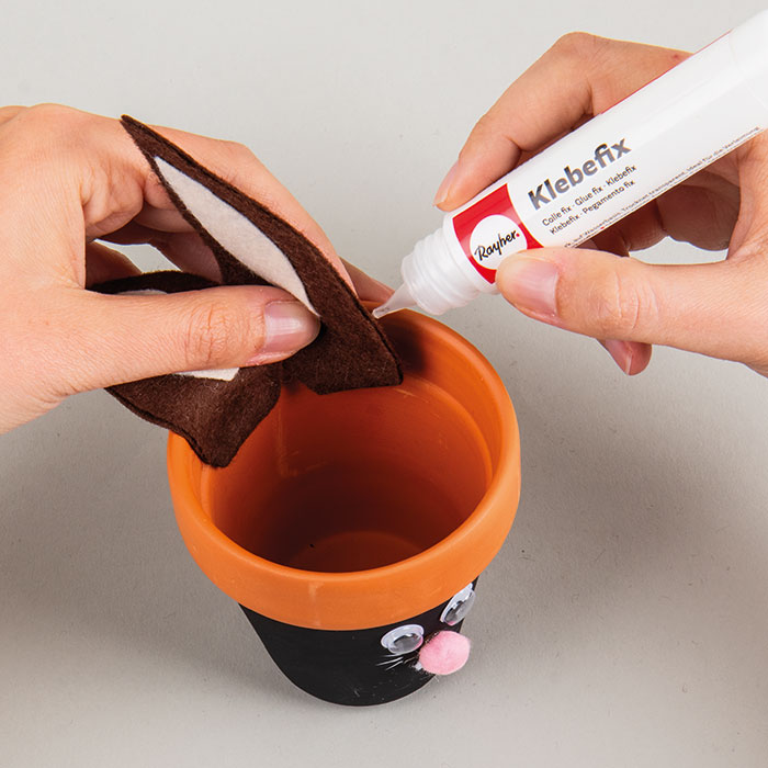 Korak 1 Crnom bojom obojite teglicu od terakote ispod ruba. Pričekajte da se boja potpuno osuši. Korak 2 Od filca izrežite uši; za dva vanjska, smeđa dijela uha filc je udvostručen radi stabilnosti. To znači da izrezujemo 4 smeđa dijela uha, polažemo dva na dva i lijepimo ih zajedno. Od bež filca dvaput izrežite unutrašnjost uha te te izreze zalijepite na odgovarajuće smeđe dijelove ušiju. Korak 3 Na obojenu teglicu od terakote zalijepite oči i pompon za nos. Od bijelog filca izrežite 2 bijela zuba i zalijepite ih ispod nosa. Korak 4 Bijelom bojom i tankim potezima nacrtajte brkove. Uši zalijepite na teglicu, a u nju posadite začinsko bilje po želji – mi smo posadili krešu.