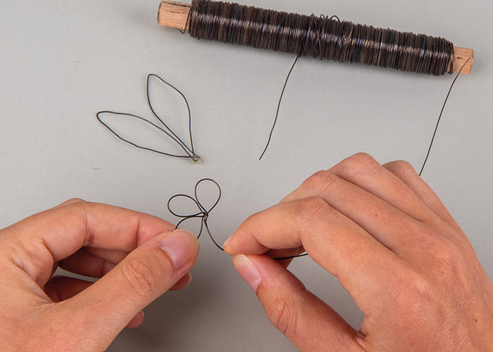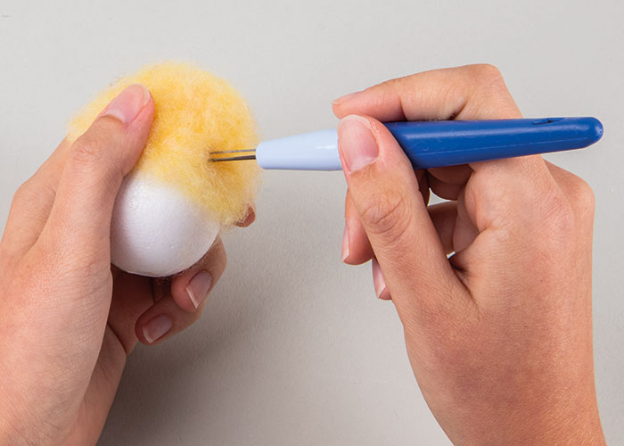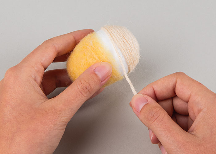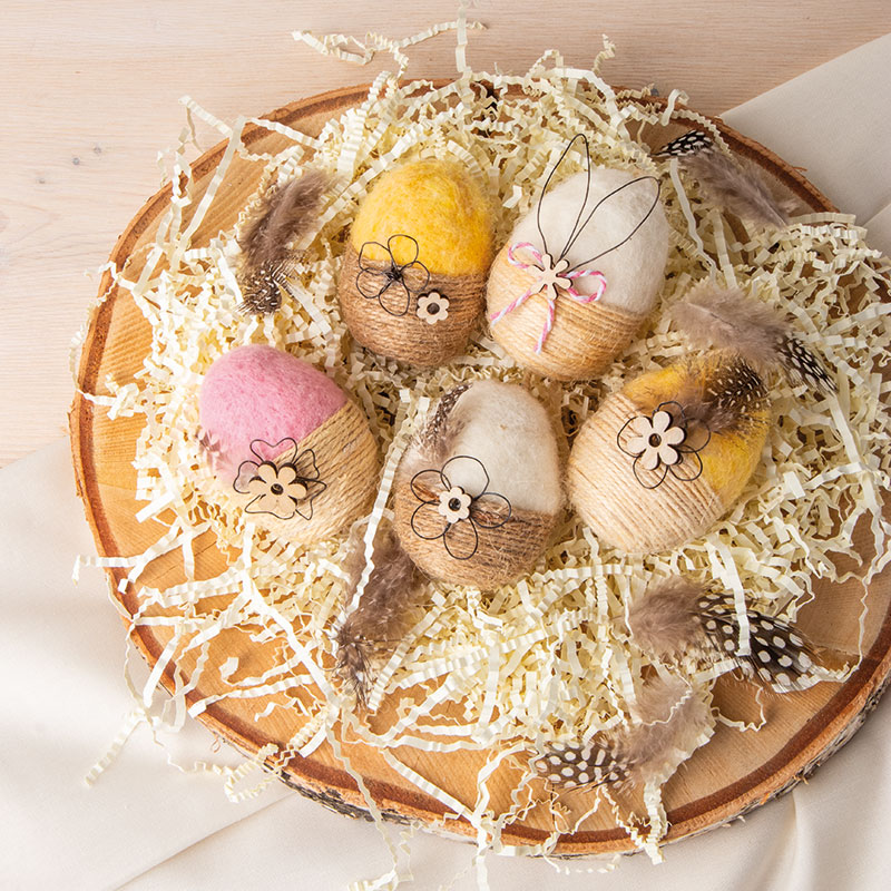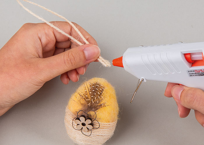 Korak 1 Najprije odrežite komad vune željene boje i položite ga oko jajeta tako da bude prekrivena otprilike gornja polovica. Vunu počnite čvrsto filcati kratkim ubodima pomoću igle za filcanje. Što češće i gušće bodete, to će vuna biti kompaktnija. Pripazite da iglom bodete što je više moguće okomito. Korak 2 Za svako jaje odrežite 2,3 metra špage od jute i pričvrstite je vrućim ljepilom na dno jajeta. Od tuda počnite namatati špagu tako da njezini slojevi leže gusto jedan uz drugoga. Povremeno je dodatno učvrstite s malo vrućeg ljepila. Namatanje završava tamo gdje počinje filcana vuna. Korak 3 Za svako jaje oblikujte komad žice u cvijet (otprilike 30 cm) ili uši zeca (otprilike 20 cm). Pričvrstite ih na mjesto vrućim ljepilom i po želji ukrasite drvenim ukrasima i ukrasnim perjem. Korak 4 Ako jaje želite objesiti, odrežite komad špage od jute duljine oko 25 cm, presavijte ga na pola i oba kraja pričvrstite s malo ljepila na filcanu vunu.