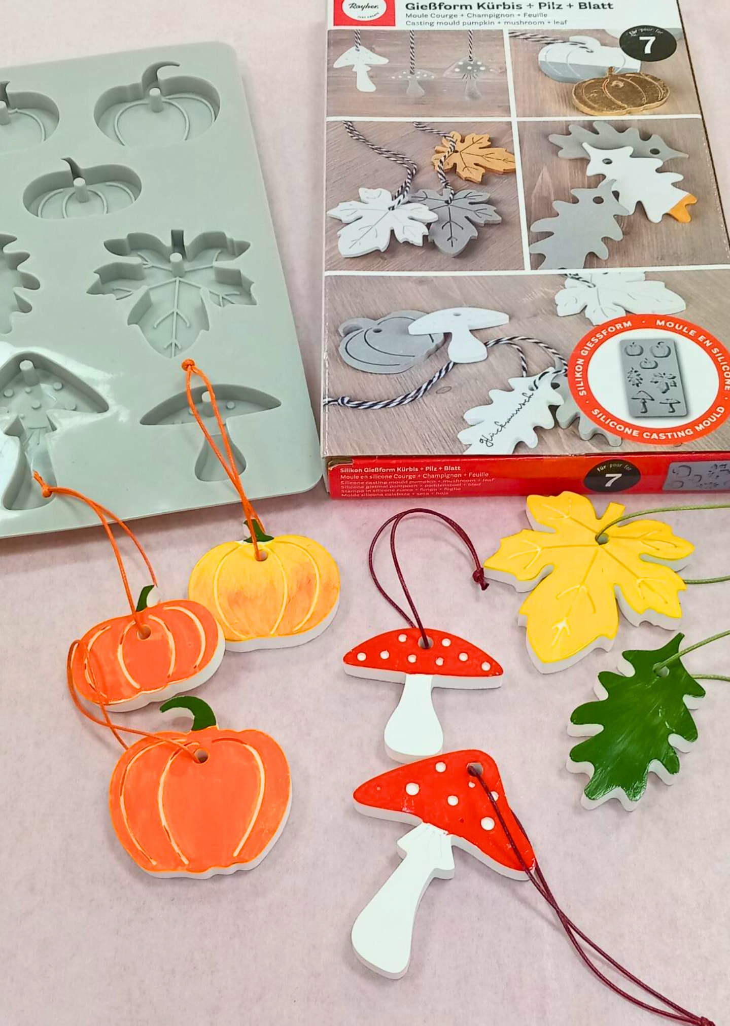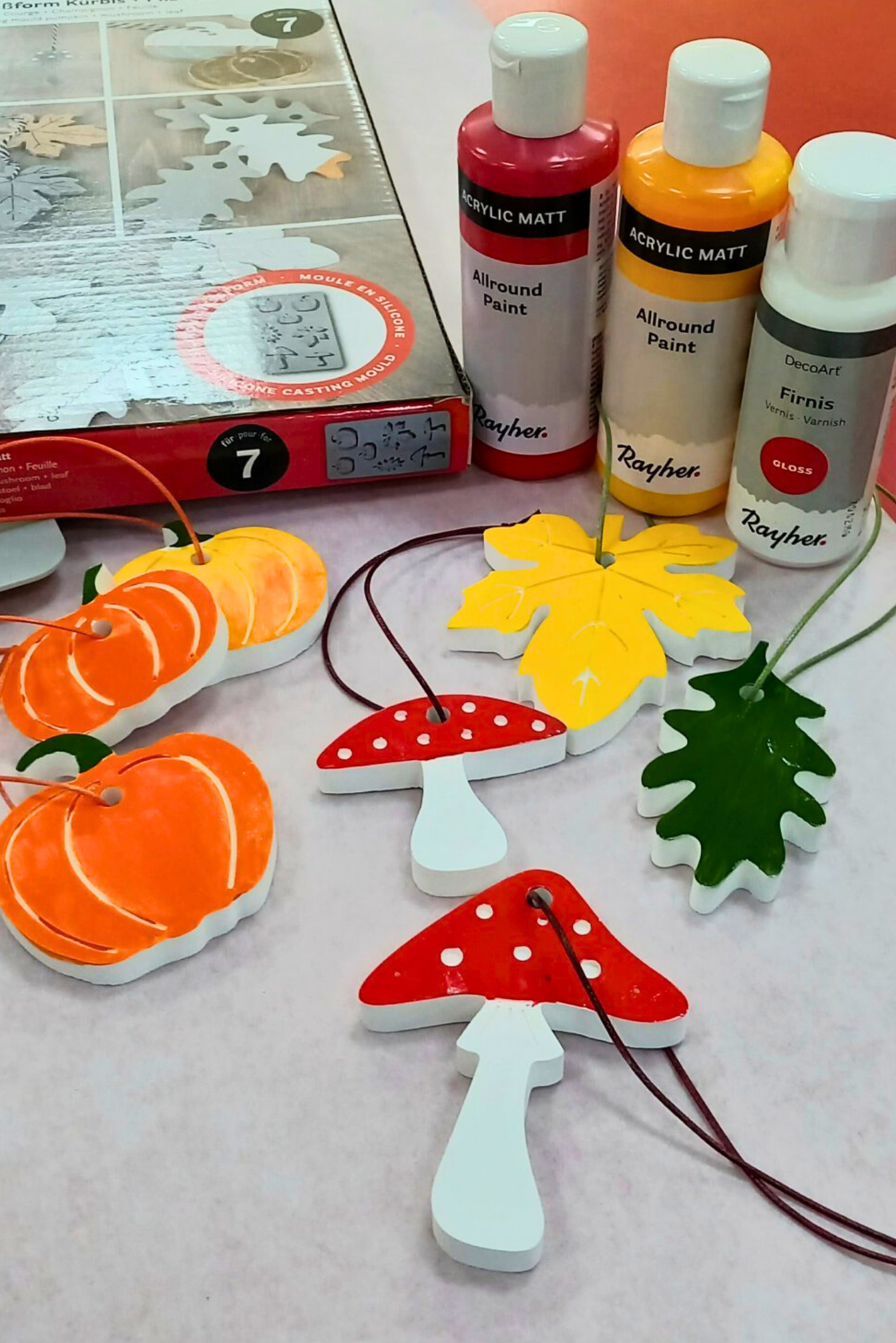 4. Akrilnim bojama obojaj odljevke po želji. Na primjer, bundevu narančasto, list žuto, a gljivicu crveno s bijelim točkicama. Pusti da se boja potpuno osuši..png)