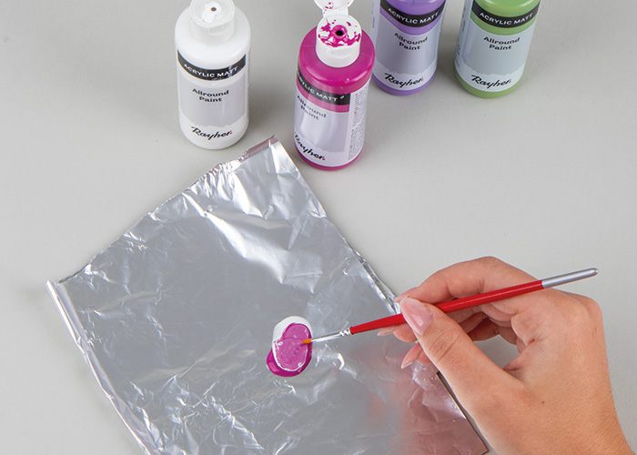 Akrilne boje u nijansama fuksije, lavande i avokada svaku zasebno pomiješajte s bijelom bojom kako biste dobili pastelne nijanse.