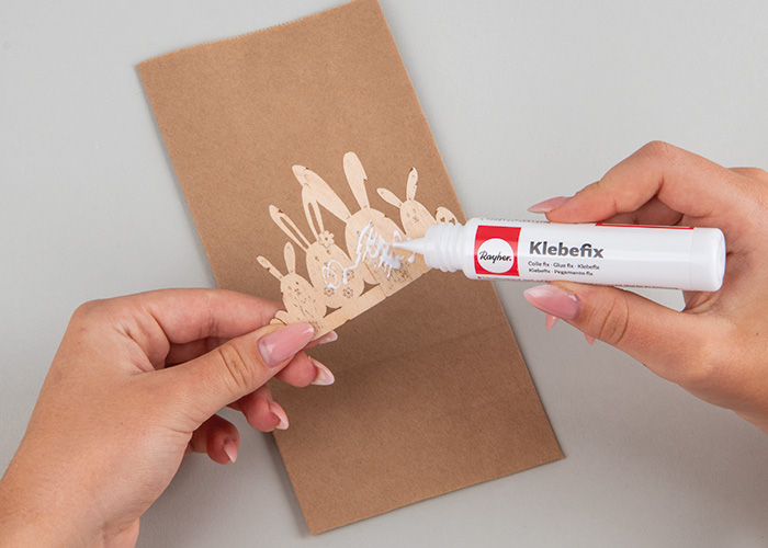 Papirnatu vrećicu položite ispred sebe i na nju zalijepite obojene izreze, otprilike 1,5 cm od donjeg ruba.