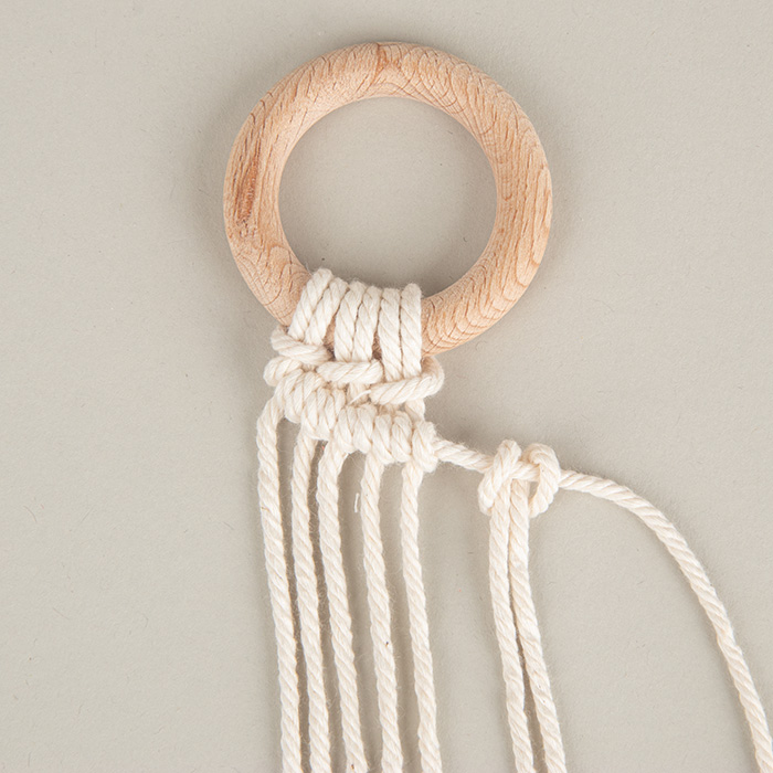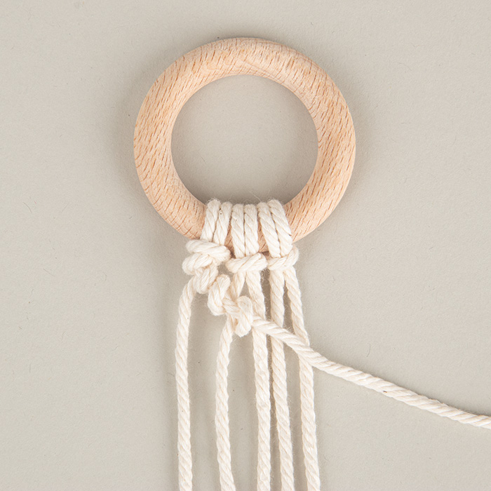 Na drveni obruč pričvrstite tri glavne niti od 1,5 m pomoću sidrenog čvora, vezanog straga. Počnite s lijeve strane s rebrastim čvorom.