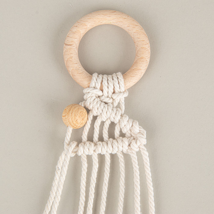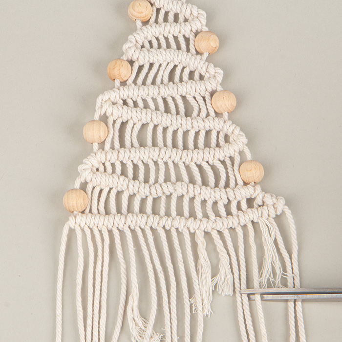 Prije nego što zavežete posljednju lijevu nit, provucite drvenu perlicu. Ponovite ova dva koraka dok ne potrošite sve niti i perlice i dok drvce ne postigne željenu duljinu.